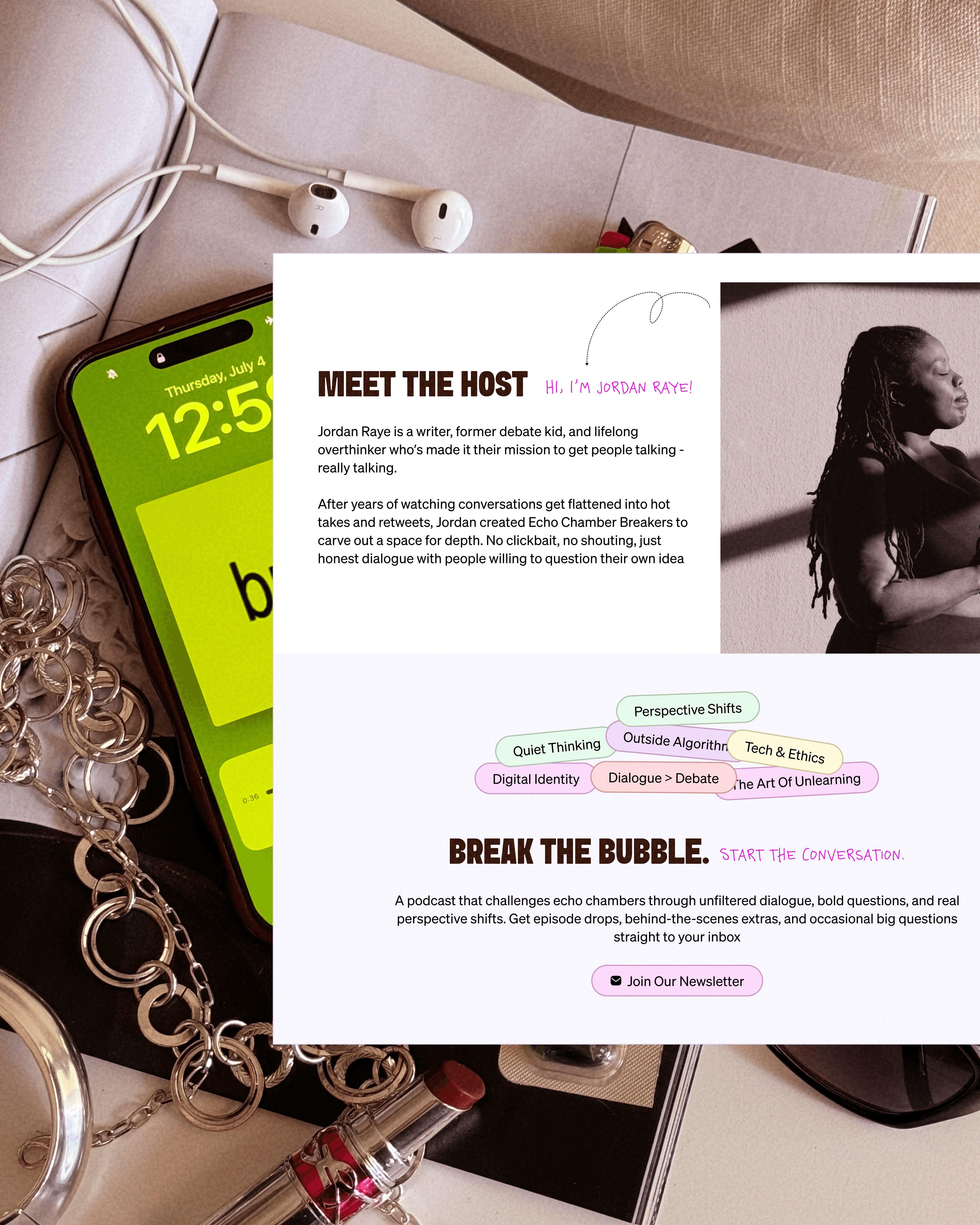 Echo Chamber Breakers is a podcast that challenges algorithm-fed bubbles and binary thinking through real, unfiltered conversations. The client wanted a bold, thoughtful identity that could visually and emotionally support the show’s mission: to create space for nuanced dialogue in a noisy world.
